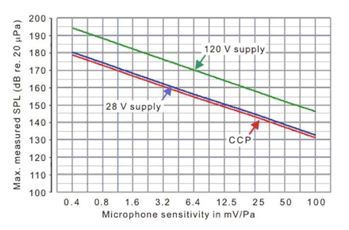 The microphone responds linearly to acoustic signals from 94 db spl up to the maximum acoustic input of 120 db spl.